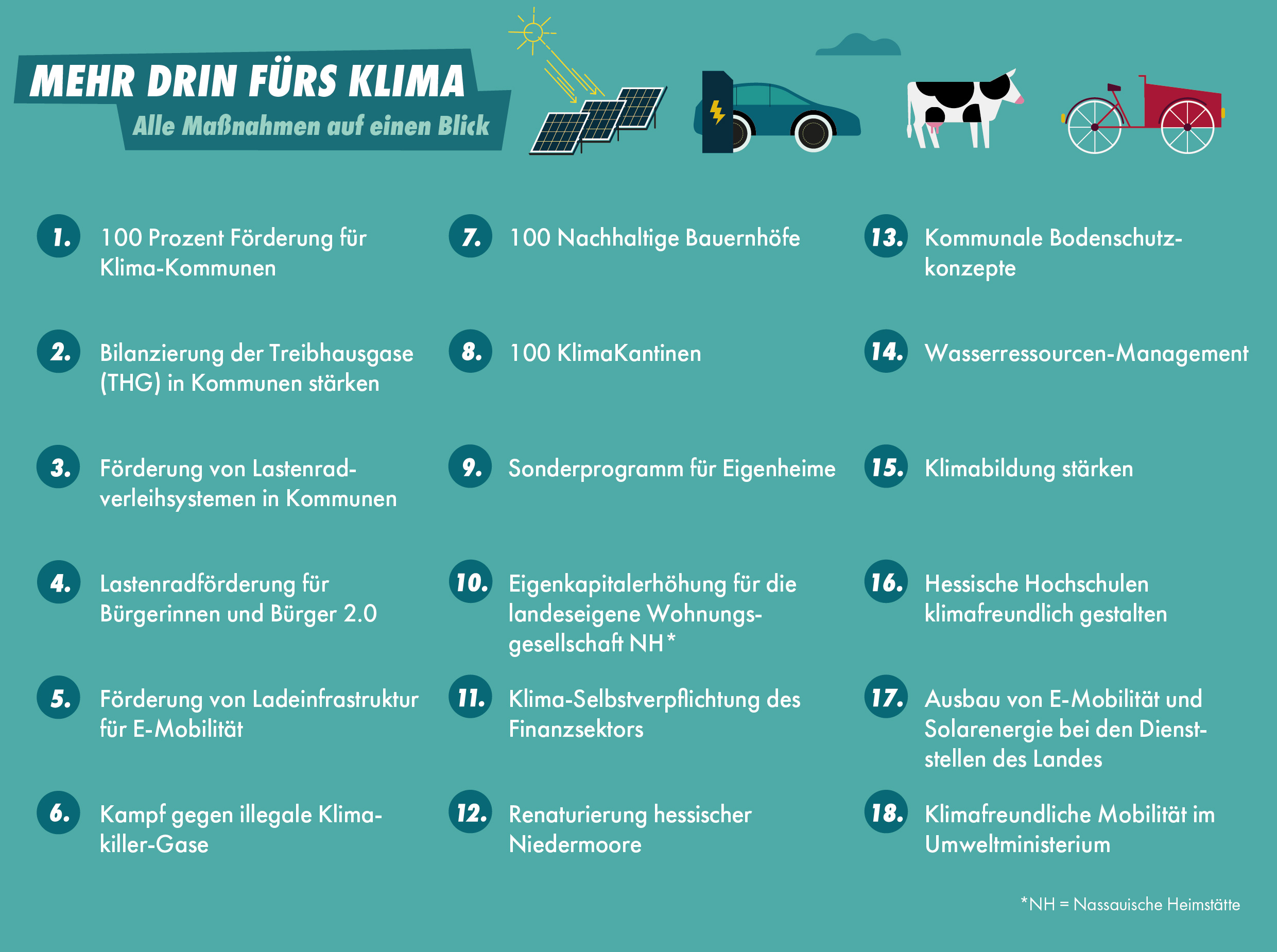 Entwickelt wurden 18 zusätzliche, starke Impulse für Klimaschutz und -wandelanpassung, die über den integrierte Klimaschutzplan Hessen 2025 (IKSP 2025) hinausgehen. Das breitgefächerte Programm reichte von klimafreundlicher Mobilität und verbesserter Infraladestruktur über nachhaltige, klimafreundliche Landwirtschaft und energetische Wohnbausanierung, Moorschutz bis hin zur Klimabildung.