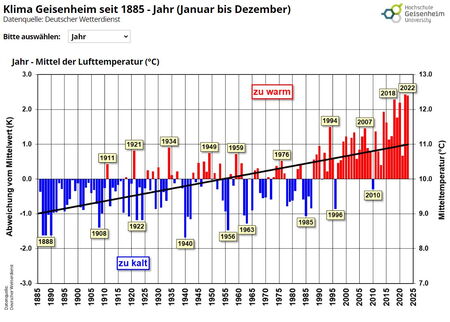 Für das Jahr 2023 wurde ein Rekordhoch an globalen fossilen CO2-Emissionen gemeldet. Darüber hinaus war 2023 in Deutschland und auch global das wärmste Jahr seit Aufzeichnungsbeginn. An der Wetterstation in Geisenheim lag die Durchschnittstemperatur 2023 nur knapp unter dem bisherigen Rekordhalter 2022 (Abbildung 1).