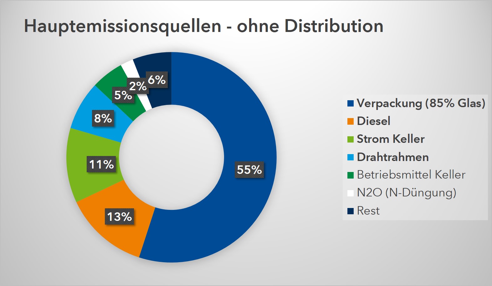 Zur Standortbestimmung der Klimawirkung wird mit Hilfe eines Treibhausgas-Rechners zunächst eine Treibhausgas-Bilanz ermittelt. Die Bilanzierung beschränkt sich hierbei nicht nur auf die Trauben- und Weinproduktion, sondern umfasst auch die vorgelagerten Bereiche (Betriebsmittel) und die nachgelagerten Ketten (Distribution). Es findet eine Analyse der Klimawirkung entlang der kompletten Wertschöpfungskette statt. Als Resultat dieser Betrachtung werden, neben einem konkreten CO2-Wert pro Produkteinheit, die Hauptemissionsquellen des weinproduzierenden Betriebes sichtbar (Abbildung 3). Im Beratungsgespräch werden dann gemeinsam Maßnahmen zur Minimierung der klimawirksamen Gase erarbeitet.