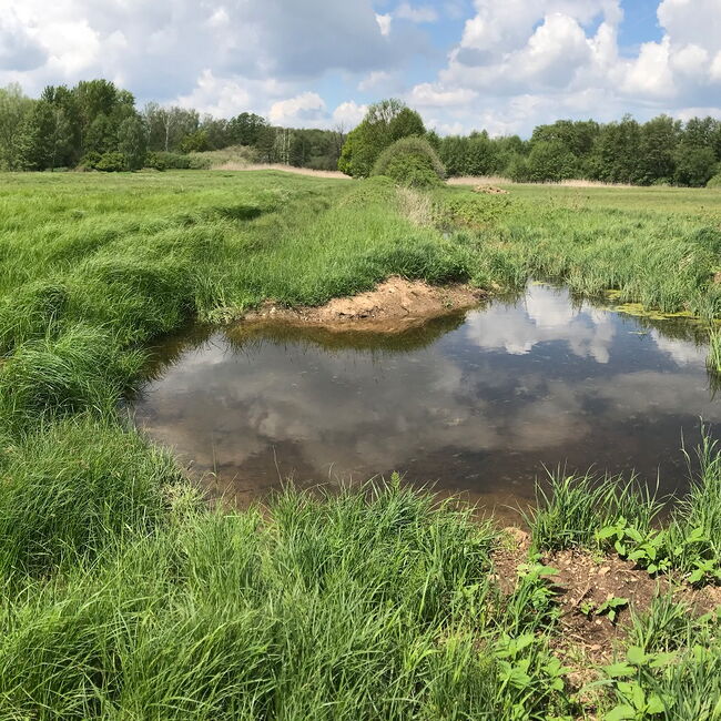 Die Vorkommen der Helm-Azurjungfer im Naturschutzgebiet "Riedwiesen bei Niederursel" in Frankfurt wurden im Rahmen von Bundesstichprobenmonitorings zu der Art lange untersucht. Dabei war der Bestandstrend durchgehend rückläufig. Eine Aufwertung des in die Nidda mündenden Rohrborngrabens durch Anlage von Grabentaschen und die Förderung submerser Pflanzenarten sollte der Lebensraum für die Helm-Azurjungfer verbessern. Nachdem die Art trotz Anlage der Grabentaschen und guter Entwicklung der submersen Vegetation in den Jahren 2022 & 2023 nicht mehr nachgewiesen werden konnte, wurde das Projekt beendet. Die Pflege der dennoch wertvollen Habitate wird seitdem über das Management des Naturschutzgebiets organisiert. (Foto ©RP Darmstadt)