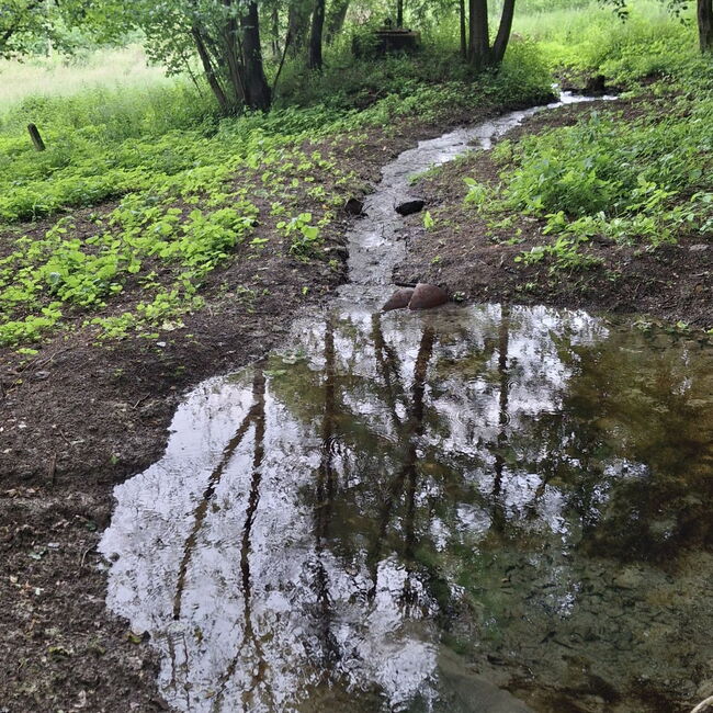 Im Regierungsbezirk Gießen konnte im Jahr 2025 ein Projekt zur Neuanlage und Renaturierung eines Gewässersystems in Neustadt in Zusammenarbeit mit dem Landkreis Marburg-Biedenkopf als Projektträger erfolgreich abgeschlossen werden. Aufgrund eines Rohrbruchs einer historischen Wasserleitung der Stadt Neustadt im Bereich „Rohrhecke“ an der Kreisgrenze zum Vogelsbergkreis traten seit dem Sommer 2022 große Wassermengen aus und vernässten großflächig bis zu drei Hektar z.T. naturschutzfachlich hochwertiges Grünland sowie landwirtschaftliche Wege. Es bot sich die einmalige Chance, das ganzjährig austretende Quellwasser zur Stützung und positiven Beeinflussung des Wasserhaushalts im Gebiet zu nutzen. Im Rahmen des Projekts wurde eine Quelle renaturiert, das Wasser des neu entstandenen Quellbachs gezielt gelenkt und mehrere jahrelang trockengefallene Stillgewässer wieder mit Wasser versorgt. So wurde ein wertvoller Lebensraum für die Klimaverliererarten Feuersalamander, Geburtshelferkröte, Kammmolch und Laubfrosch wiederhergestellt und neu geschaffen. (Foto ©RP Gießen)